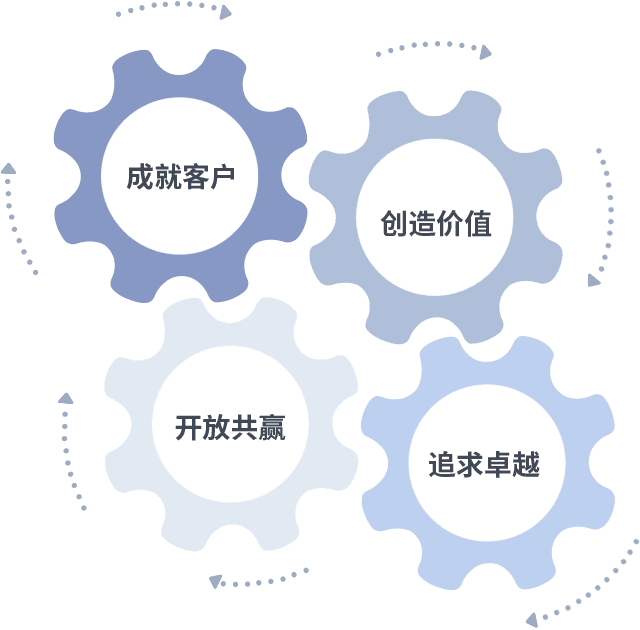 成就客户是一切决策的出发点,,创造价值是衡量所有工作的标准,,,追求卓越是我们做事做人的态度,,,,开放共赢是我们的格局也是最终的结果。。价值观的齿轮环环相扣,,,推动着组织里的每个人不断向前。。。