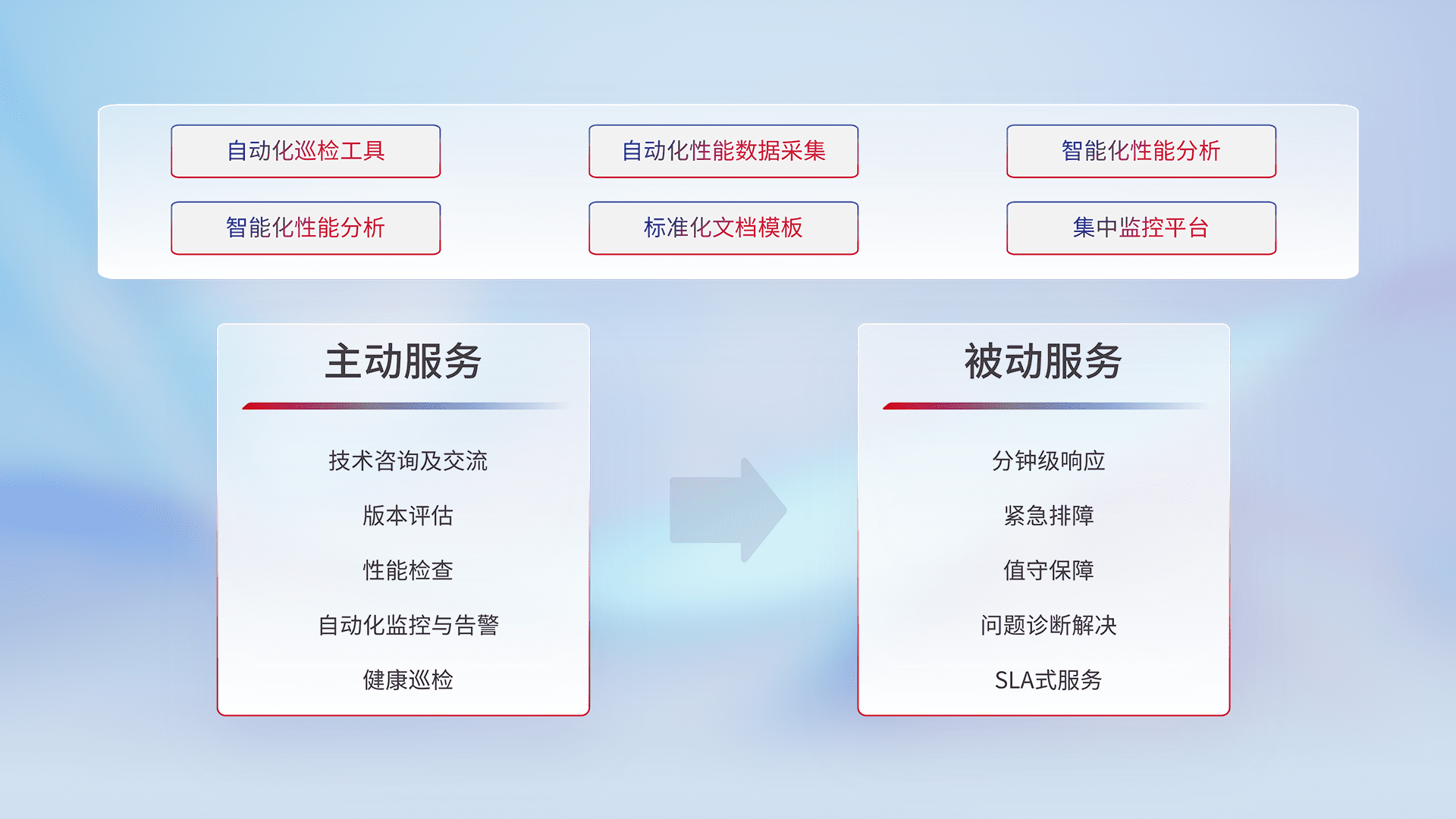 智能化工具和标准化文档,,,,保障服务质量,,,,提供主动服务(包含技术咨询、、、、版本评估、、性能检查、、、自动化监控与告警、、健康巡检)和被动服务包含(分钟级响应、、、、紧急排障、、、值守保障、、问题诊断解决、、SLA服务)。。。